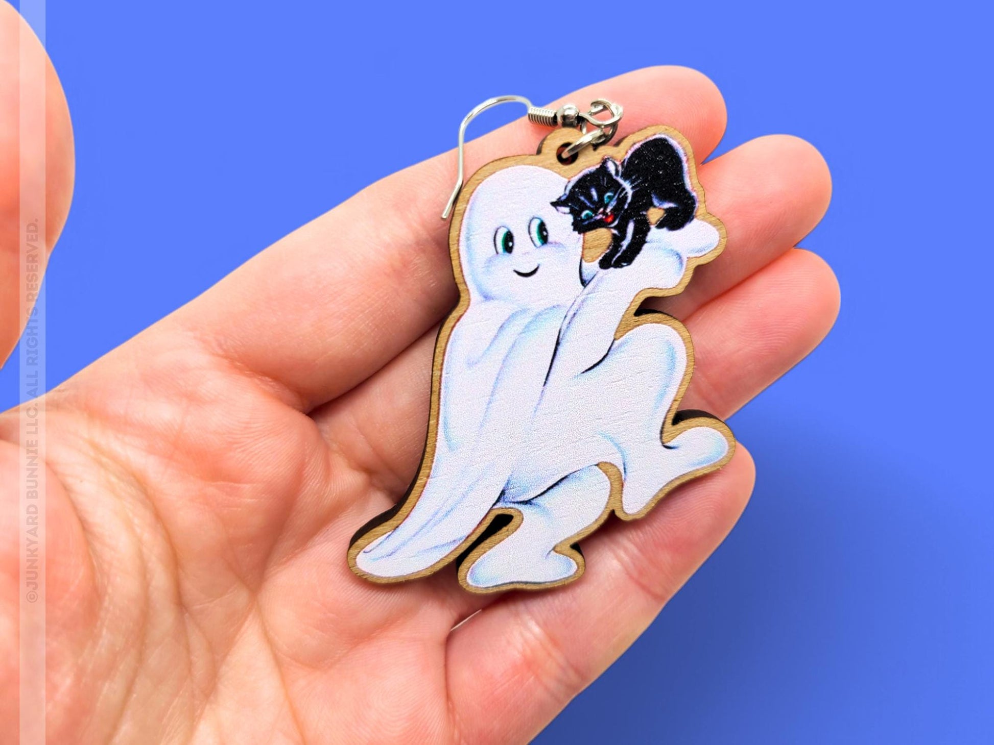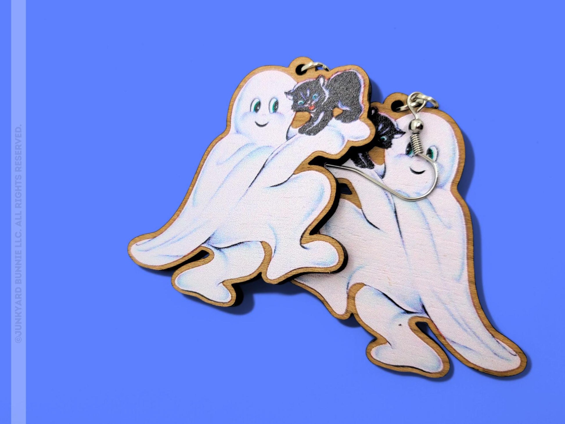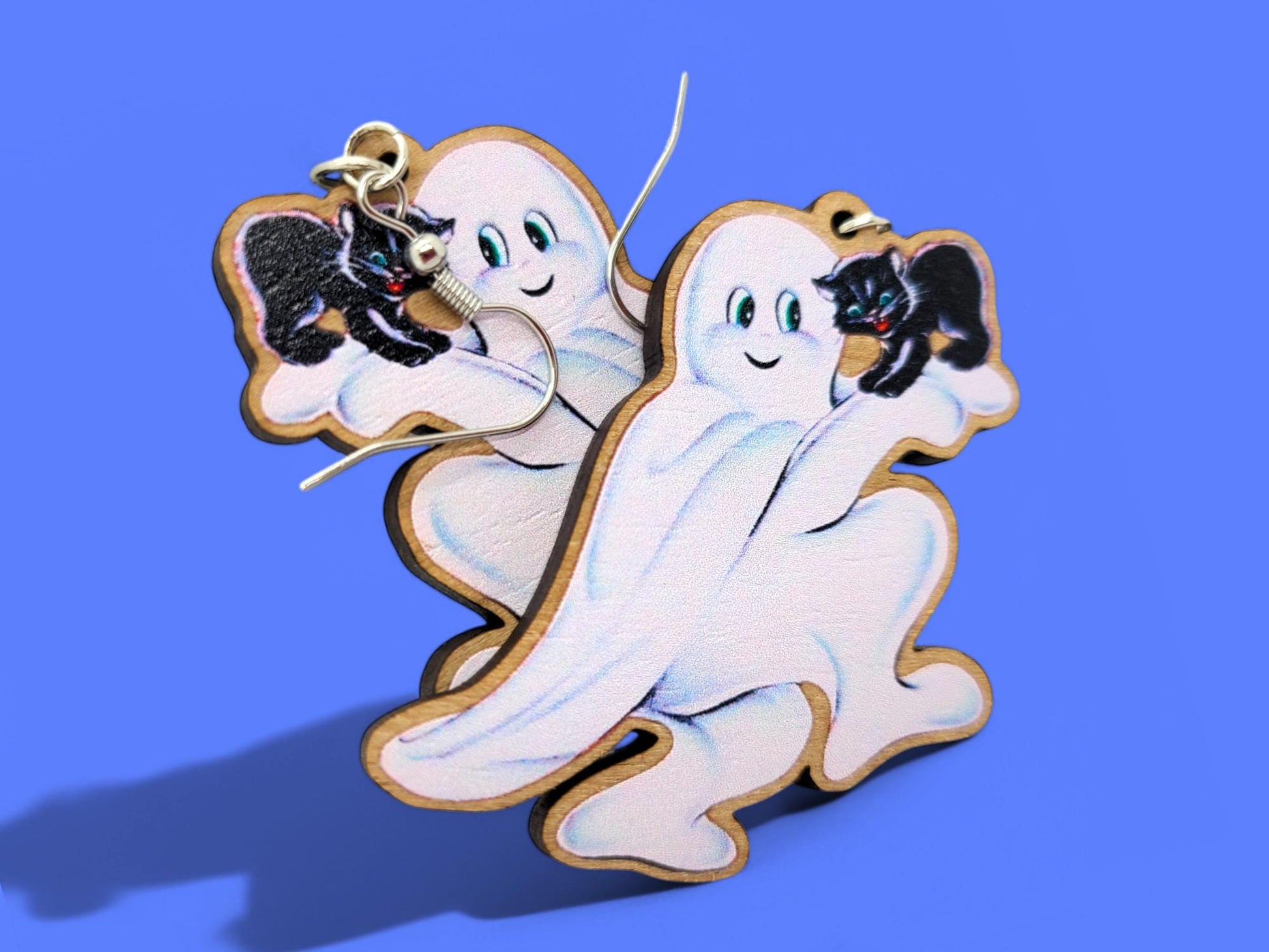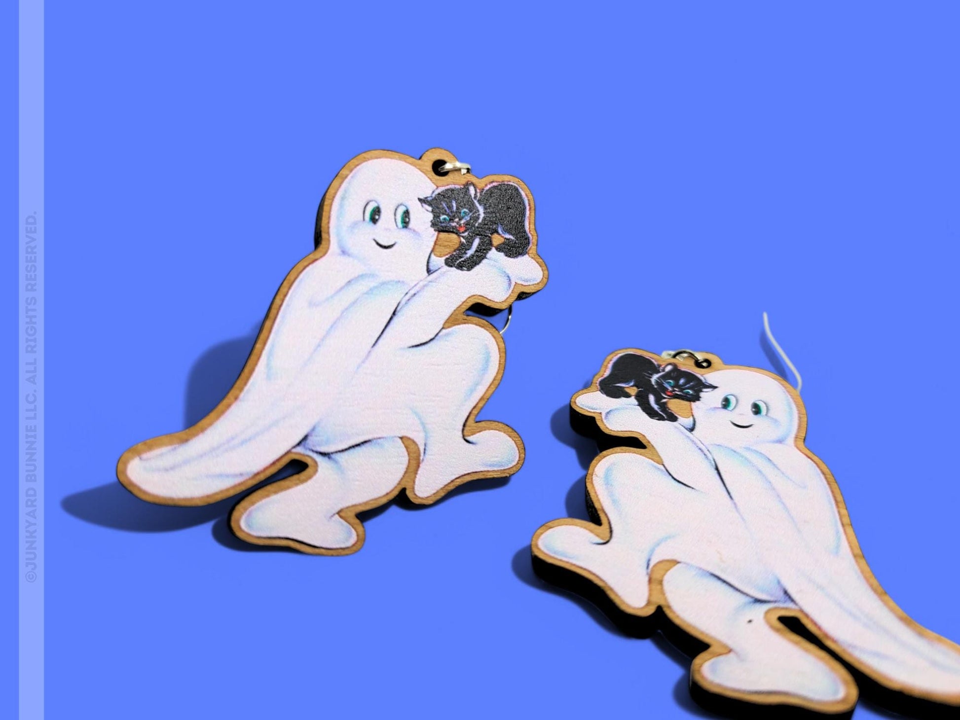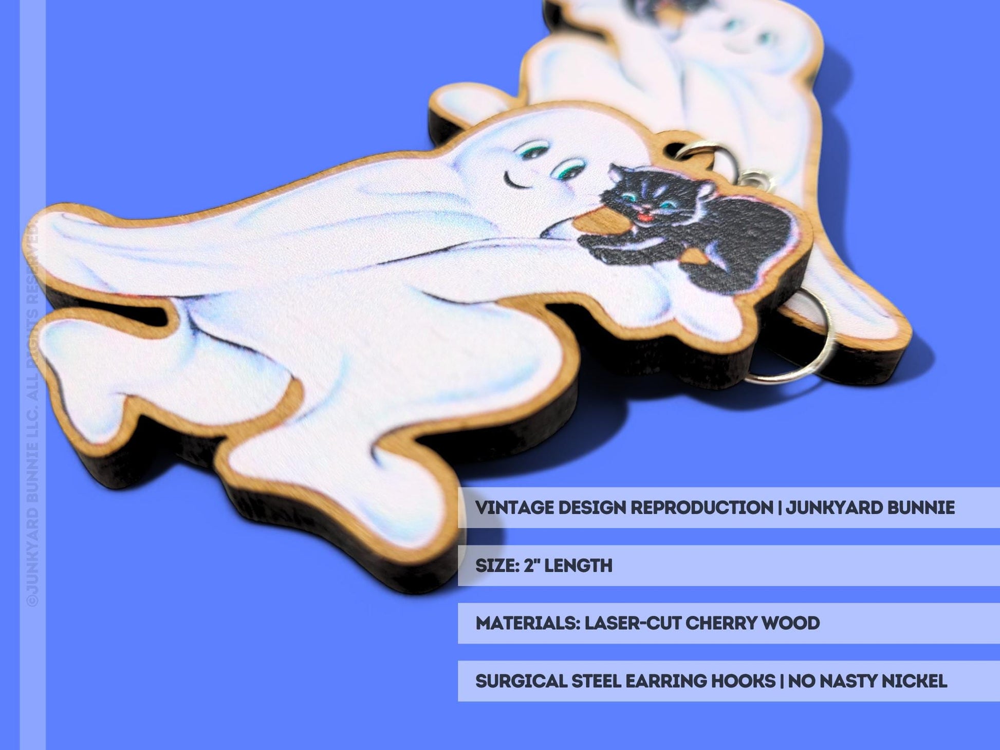 Vintage Halloween Ghost & Black Cat Wooden Earrings